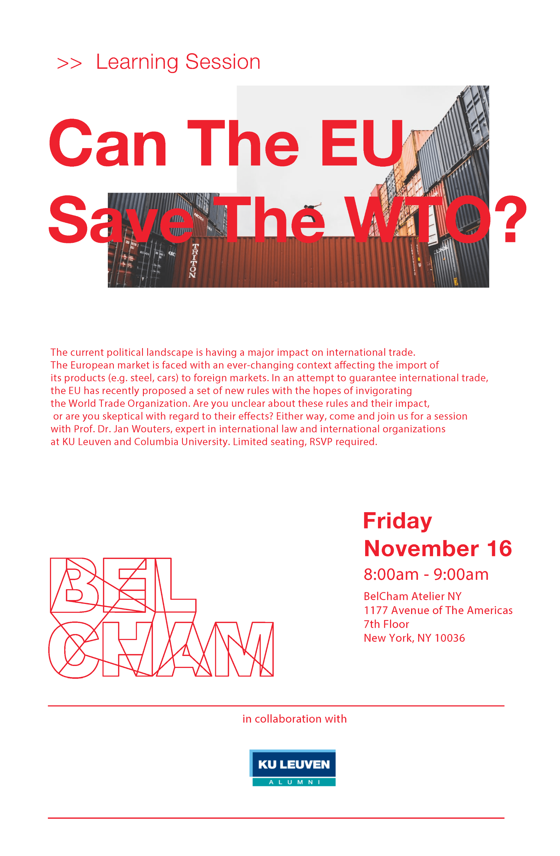 The current political landscape is having a major impact on international trade. The European market is faced with an ever-changing context affecting the import of its products (e.g. steel, cars) to foreign markets. In an attempt to guarantee international trade, the EU has recently proposed a set of new rules with the hopes of invigorating the World Trade Organization. Are you unclear about these rules and their impact, or are you skeptical with regard to their effects? Either way, come and join us for a session with Prof. Dr. Jan Wouters, expert in international law and international organizations at KU Leuven and Columbia University. Limited seating, RSVP required.